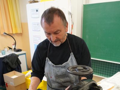 Am zweiten Tag wurden weiche, styroporartige Platten mit Bleistift graviert, mit der Walze Farbe aufgewalzt und als Hochdruck an der Presse gedruckt.